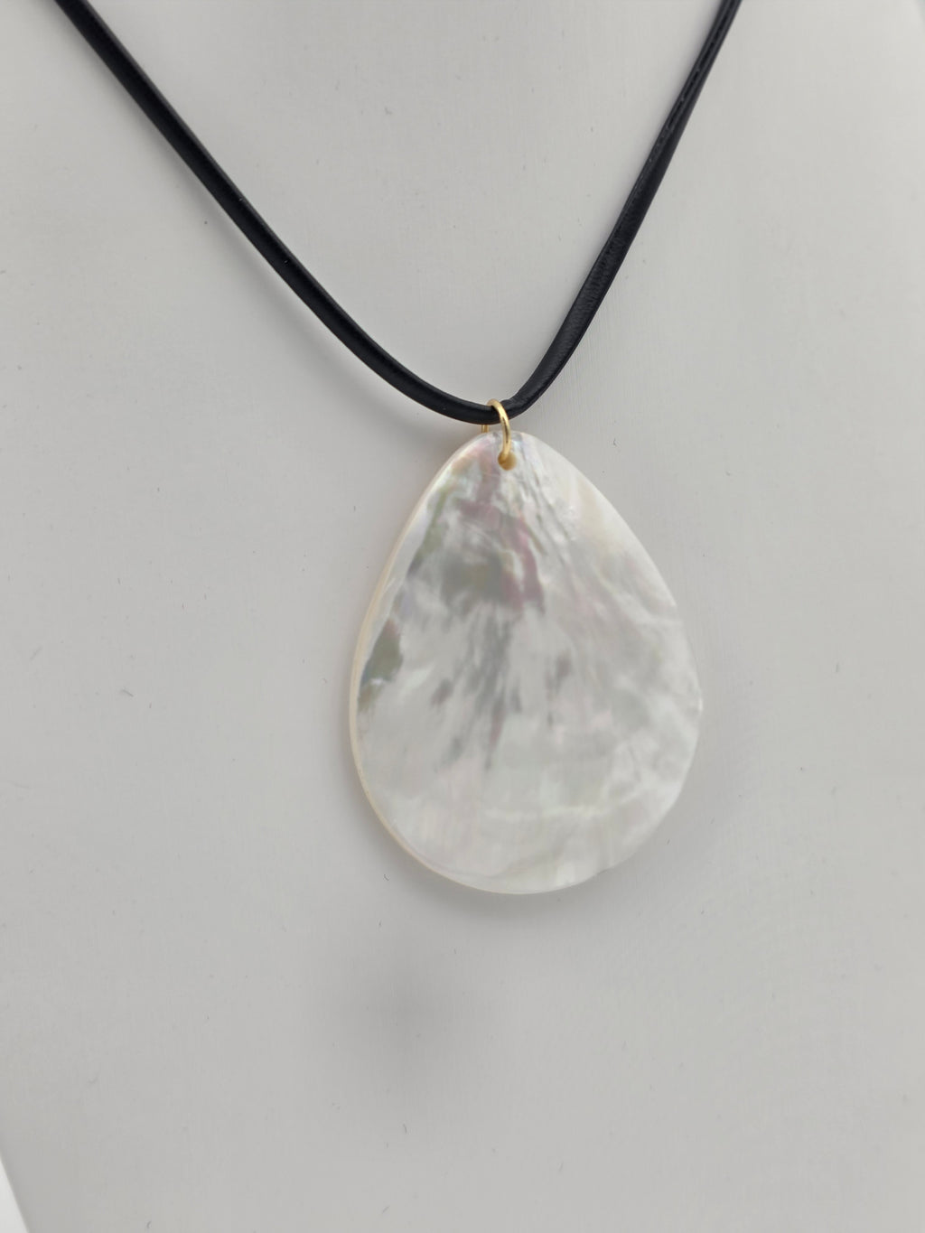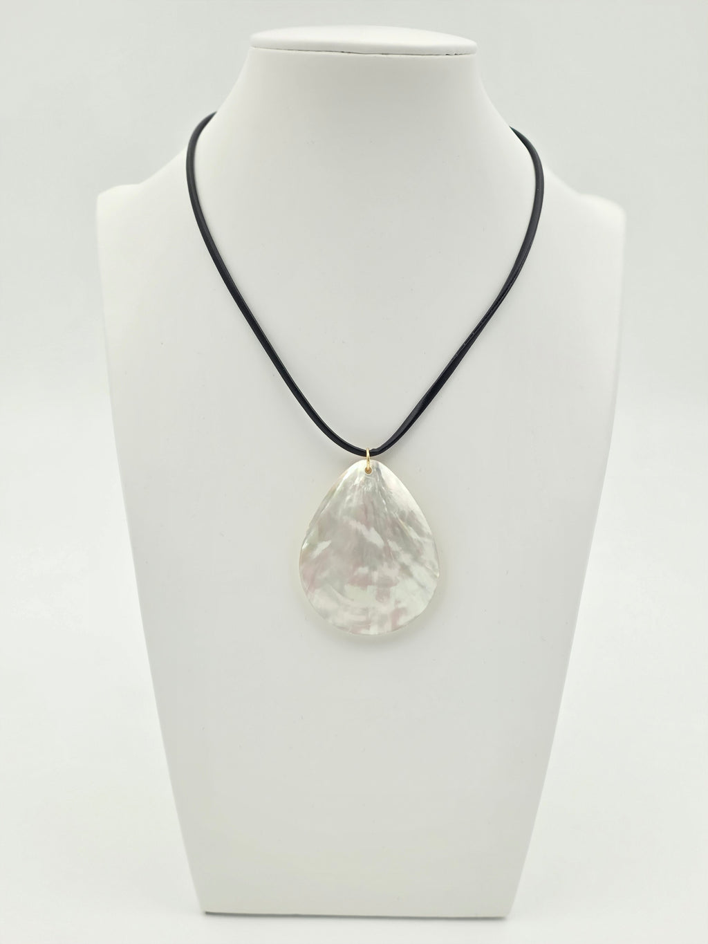 BLACK PLEATHER CORD NECKLACE WITH TEAR DROP DISC PEARL PENDANT ✦ NC-SJ2003