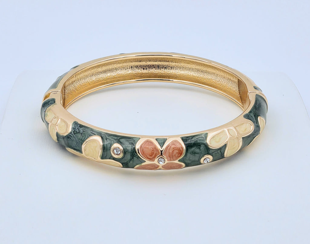 This exquisite bracelet features a gold-plated bangle adorned with delicate beige and burnt copper flower motifs, each accented by small diamonds. Its refined design combines subtle color contrasts with sparkling details, making it a sophisticated accessory that enhances any ensemble with elegance and expert craftsmanship.
