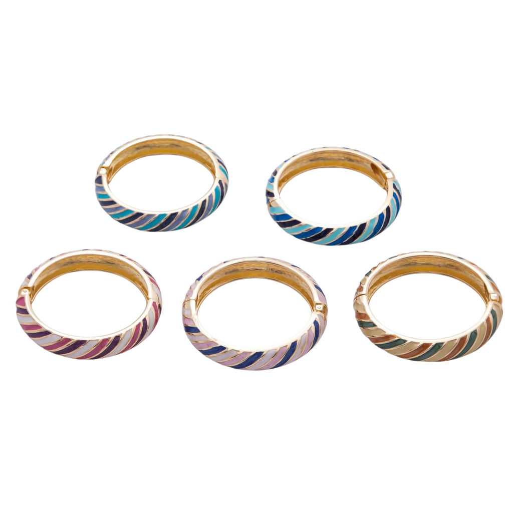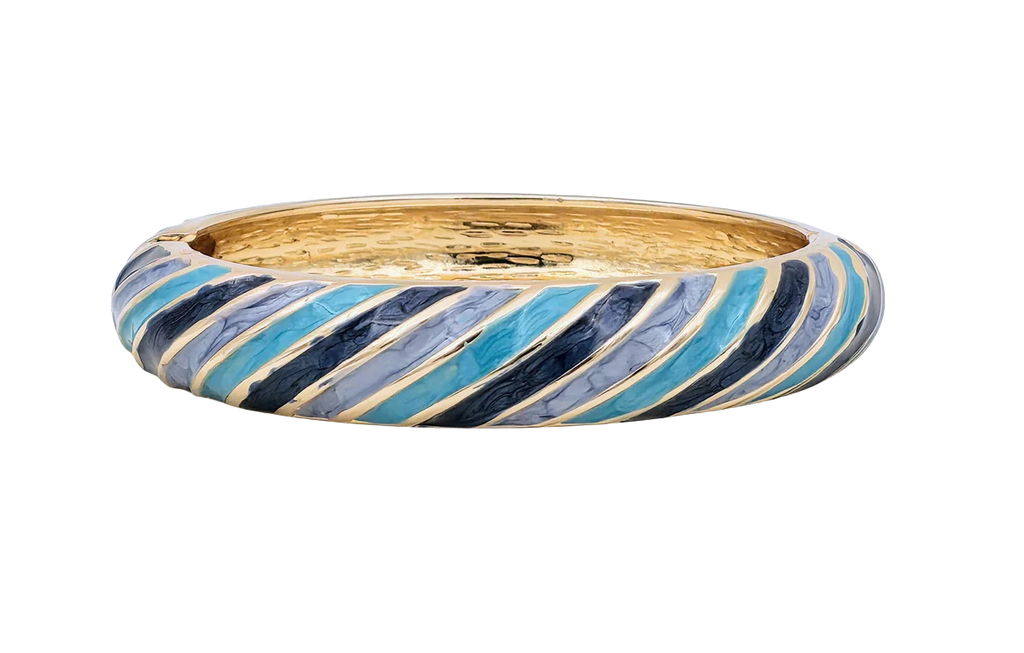 This enamel pearl bangle features a refined blend of three shades of navy, blue and aquamarine; all set on a gold-plated band. Its stripped, elegant design offers a sophisticated accessory that complements both casual and formal attire, adding a subtle yet distinctive touch of color and shine to your wrist. Crafted for durability and style, this bracelet is a versatile addition to any jewelry collection.