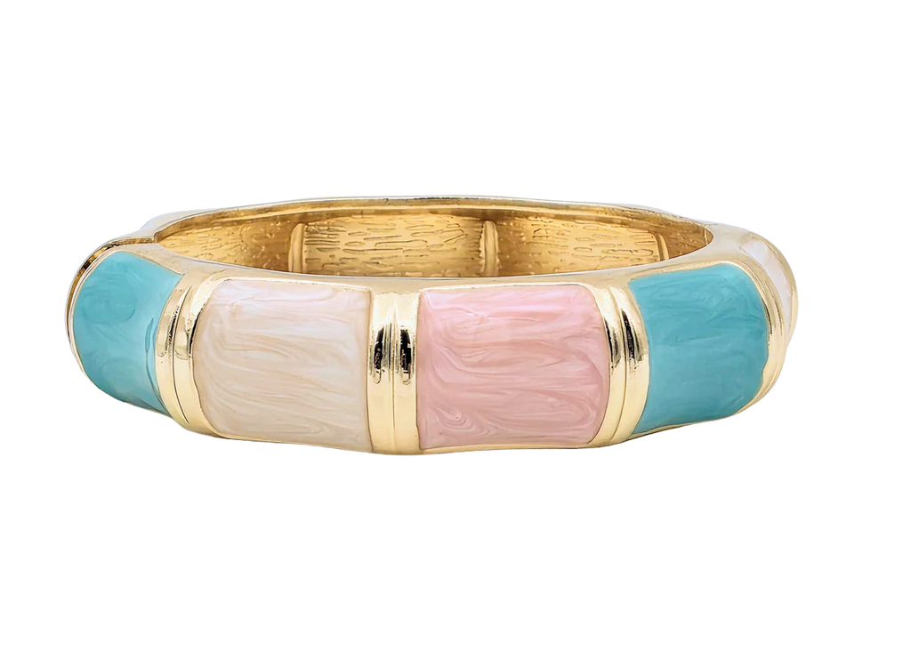 This enamel bangle bracelet features an elegant blend of turquoise, beige and baby pink hues, all beautifully gold plated for a refined finish. Its sophisticated color palette and durable plating make it a versatile accessory that complements both casual and formal attire, adding a subtle yet distinctive touch of style. Perfect for those seeking expert craftsmanship and timeless design in their jewelry collection.