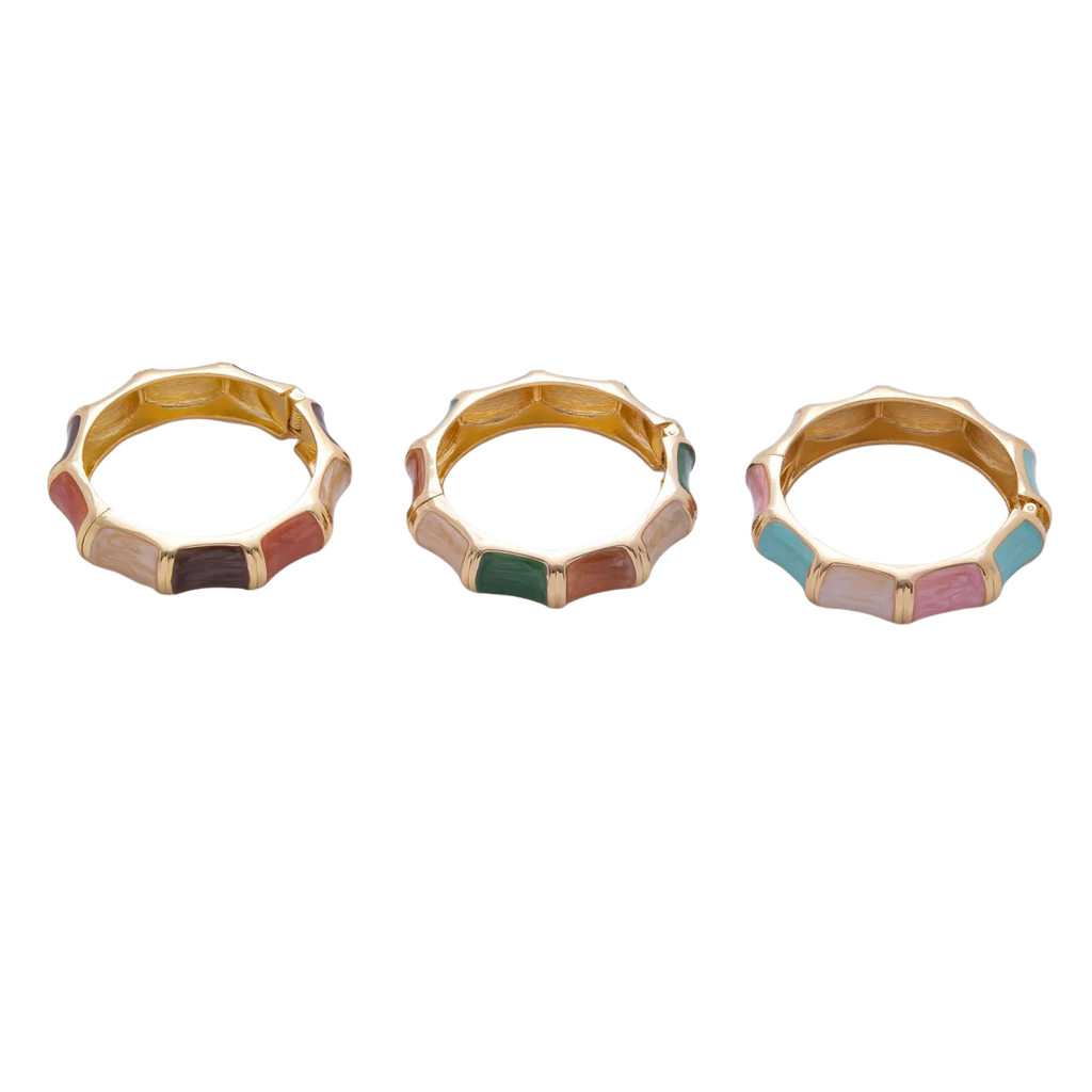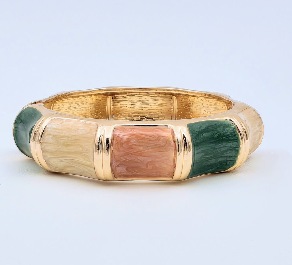 This enamel bangle bracelet features an elegant blend of green, beige and light brown hues, all beautifully gold plated for a refined finish. Its sophisticated color palette and durable plating make it a versatile accessory that complements both casual and formal attire, adding a subtle yet distinctive touch of style. Perfect for those seeking expert craftsmanship and timeless design in their jewelry collection.