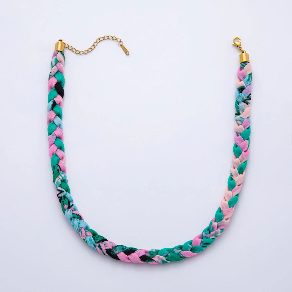 Evil Eye Gold Leaf Braided Blue-Pink Scarf Necklace NC-2013
