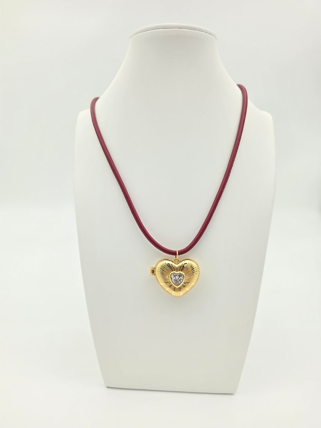 MAROON ADJUSTABLE BAGUETTE CORD NECKLACE WITH GOLD HEART LOCKET ✦ NC-SJ2011